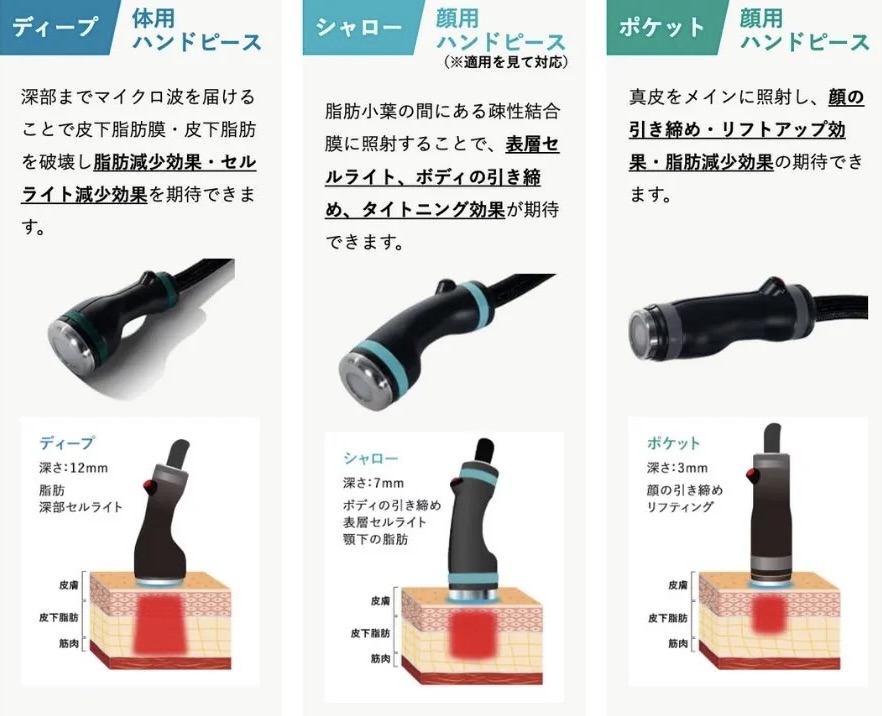 治療の目的や照射する層の深さに応じて、ハンドピースを使い分けます。